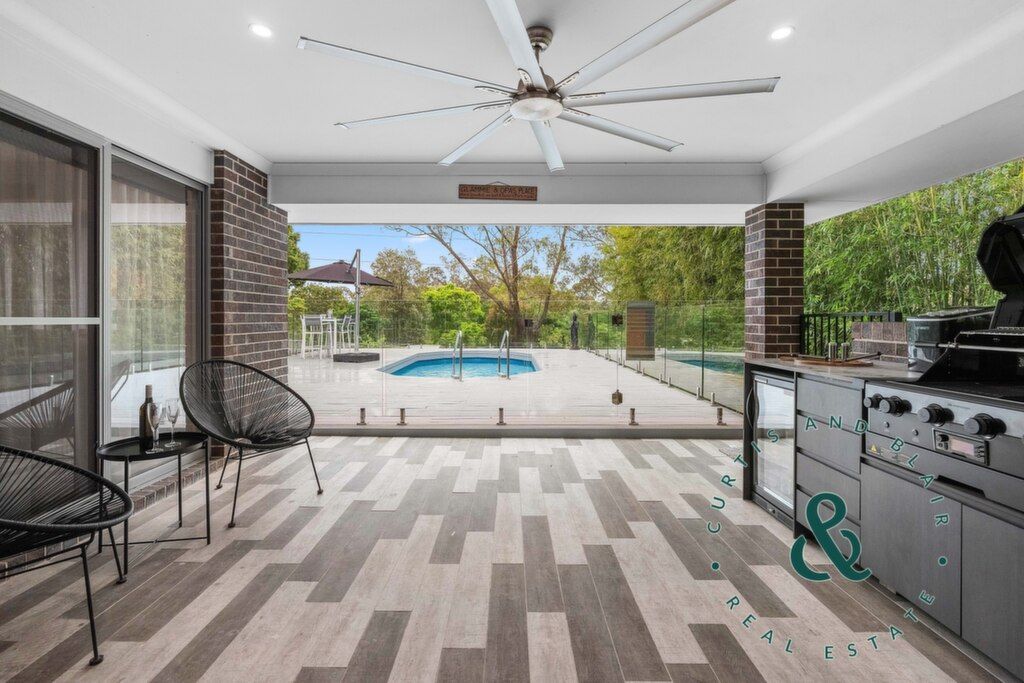 Two separate living areas, four bedrooms and two bathrooms ensure space for everyone, while the stylish kitchen takes centre stage. It’s sleek and practical with stone benchtops, walk-in pantry, and direct views to the tiled alfresco. Out here, entertaining is effortless, with a built-in BBQ, fridge, sink, and marble benchtop creating the perfect setup for summer afternoons beside the saltwater pool and surrounding deck. There’s even an outdoor shower for post-swim rinse-offs. Beyond the pool, the private backyard continues with raised veggie beds, a fire-pit area, and established greenery creating a tranquil garden backdrop, while solar power, and multiple split-system air conditioners add everyday practicality.